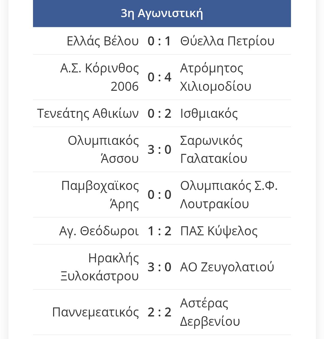 Ολοκληρώθηκε χθες Σάββατο 11 Οκτωβρίου και η 3η αγωνιστική για το πρωτάθλημα της Α’ Κατηγορίας Κορινθίας.