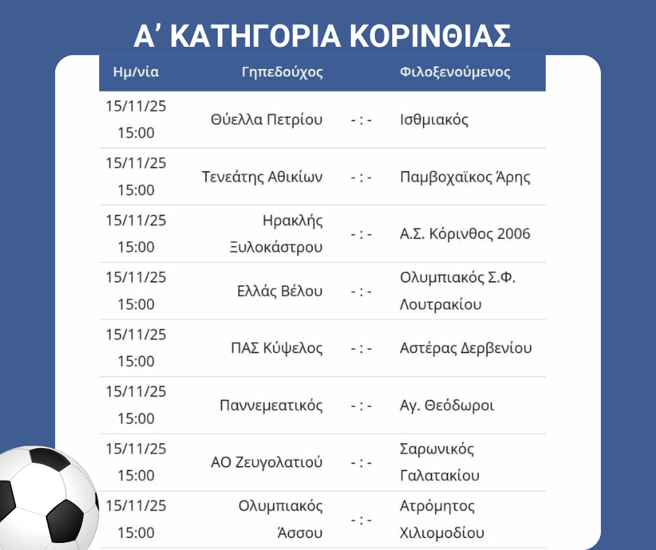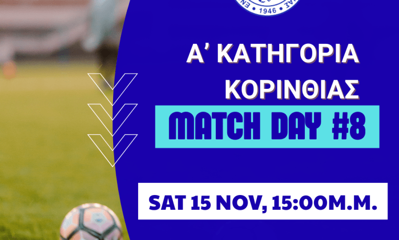 Η 8η αγωνιστική της Α’ Κατηγορίας Κορινθίας αναμένεται με μεγάλο ενδιαφέρον, καθώς όλα τα παιχνίδια έχουν βαθμολογική σημασία. Οι ομάδες της κορυφής, αλλά και της ουράς δίνουν σημαντικά μάτς για την επίτευξη των στόχων τους, καθιστώντας την αγωνιστική καθοριστική για τη συνέχεια του πρωταθλήματος.