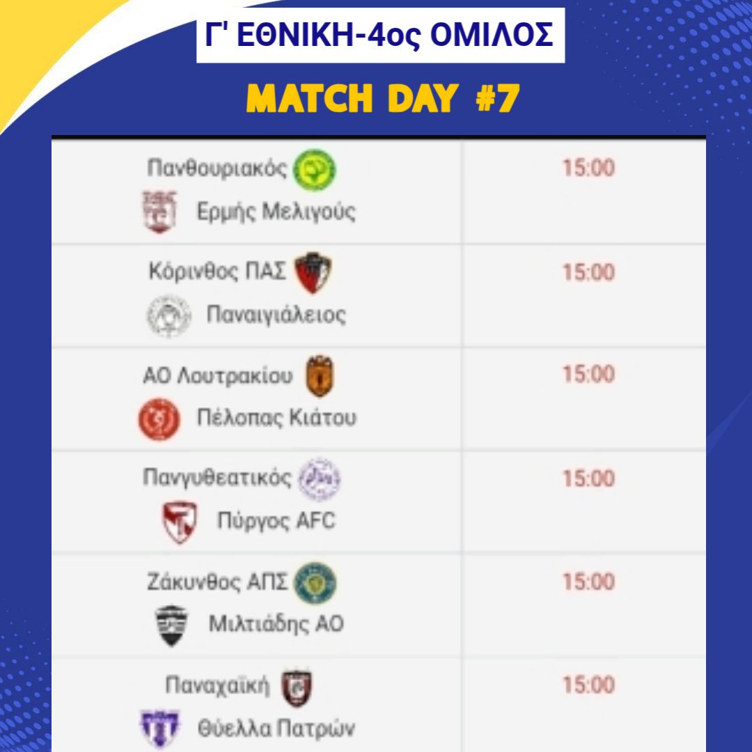 Η 7η αγωνιστική του 4ου Ομίλου της Γ’ Εθνικής αναμένεται με μεγάλο ενδιαφέρον, καθώς το πρωτάθλημα έχει πάρει «φωτιά» και οι διαφορές στις πρώτες θέσεις είναι οριακές. Ο Πύργος AFC και ο Παναγιάλειος οδηγούν την κούρσα με 13 βαθμούς, ενώ ακολουθούν Ζάκυνθος και Μιλτιάδης με 10, σε έναν όμιλο όπου τίποτα δεν δείχνει εύκολο.