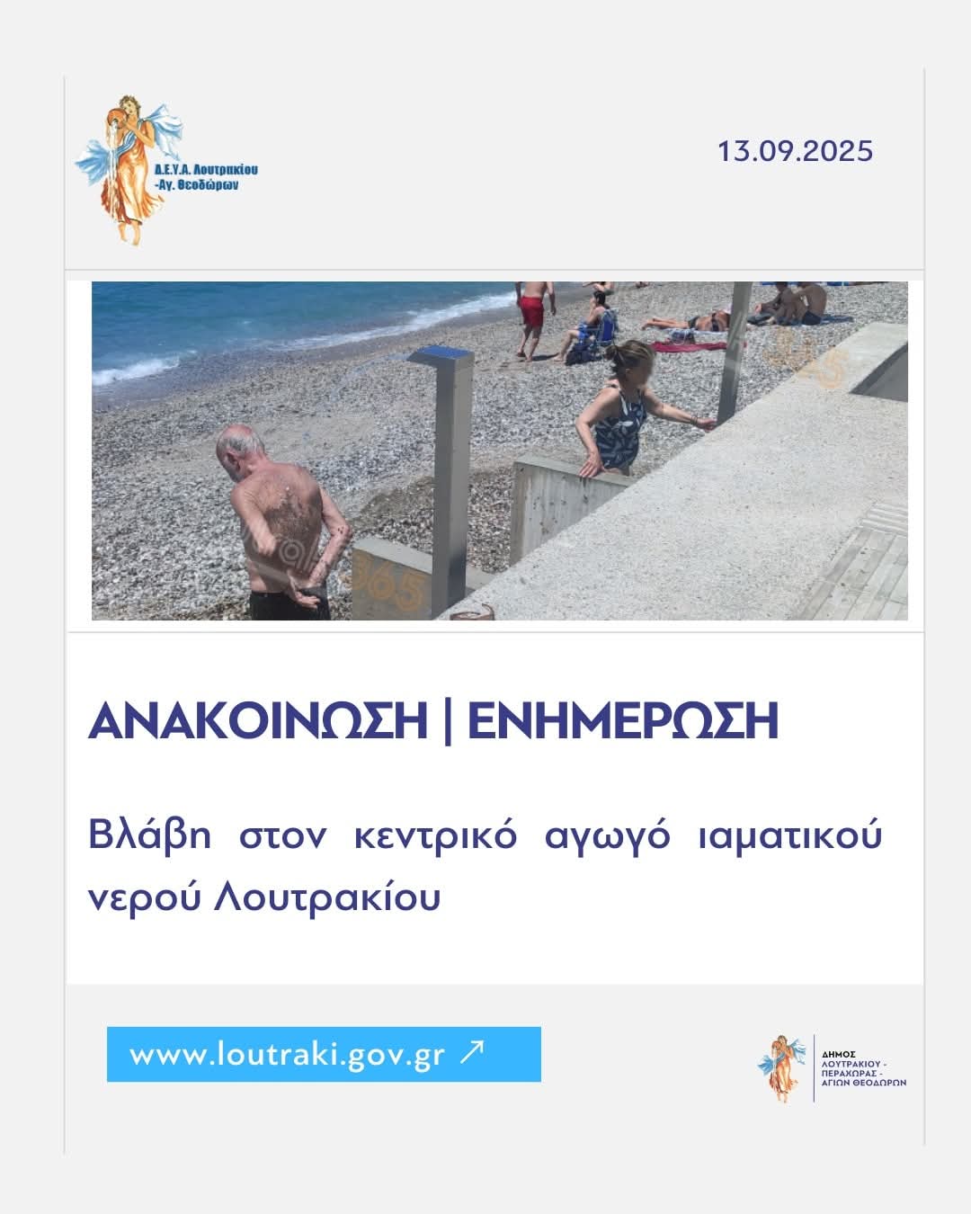 Ο Δήμος Λουτρακίου – Περαχώρας – Αγίων Θεοδώρων ενημερώνει ότι σήμερα, Σάββατο 13 Σεπτεμβρίου, παρουσιάστηκε βλάβη στον κεντρικό αγωγό ιαματικού νερού που τροφοδοτεί τα ντους της παραλίας Λουτρακίου.