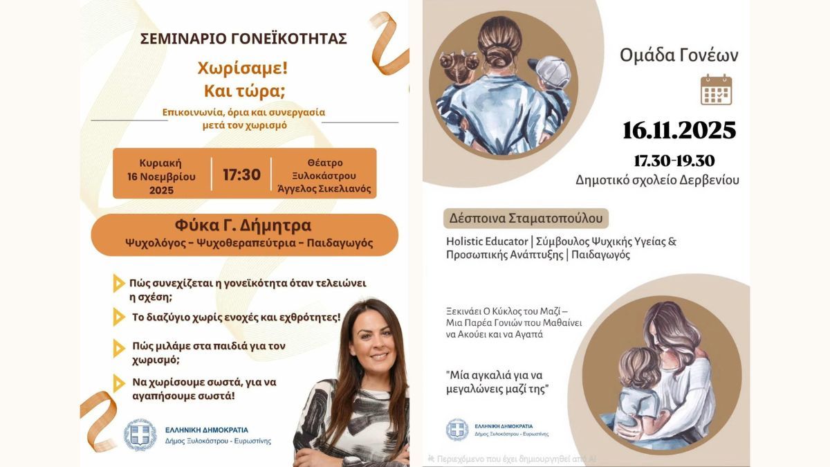 Ο Δήμος Ξυλοκάστρου – Ευρωστίνης συνεχίζει με επιτυχία τον κύκλο των Σχολών Γονέων, μέσα από δράσεις που στοχεύουν στην ενδυνάμωση των γονέων και τη στήριξη της σύγχρονης οικογένειας.