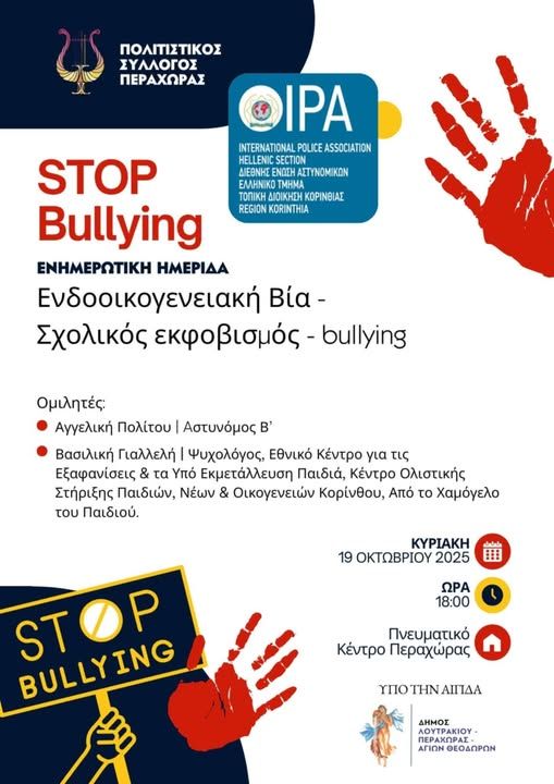 Πολιτιστικός Σύλλογος Περαχώρας: Ενημερωτική Ημερίδα για την Ενδοοικογενειακή Βία & τον Σχολικό Εκφοβισμό
