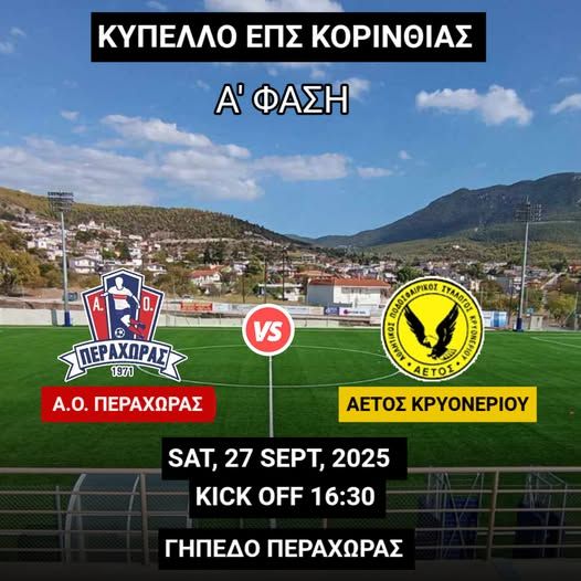 Σάββατο 27/9 live μετάδοση από το Εν Λουτρακίω, ο αγώνας Κυπέλλου Κορινθίας, Α.Ο. Περαχώρας-Αετός Κρυονερίου