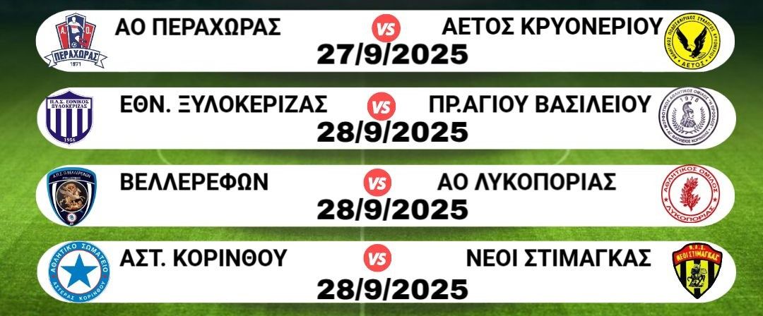 Ολοκληρώνεται η Α’ Φάση του Κυπέλλου Κορινθίας αυτό το Σαββατοκύριακο 27-28/9/2025, με την διεξαγωγή τεσσάρων αγώνων.