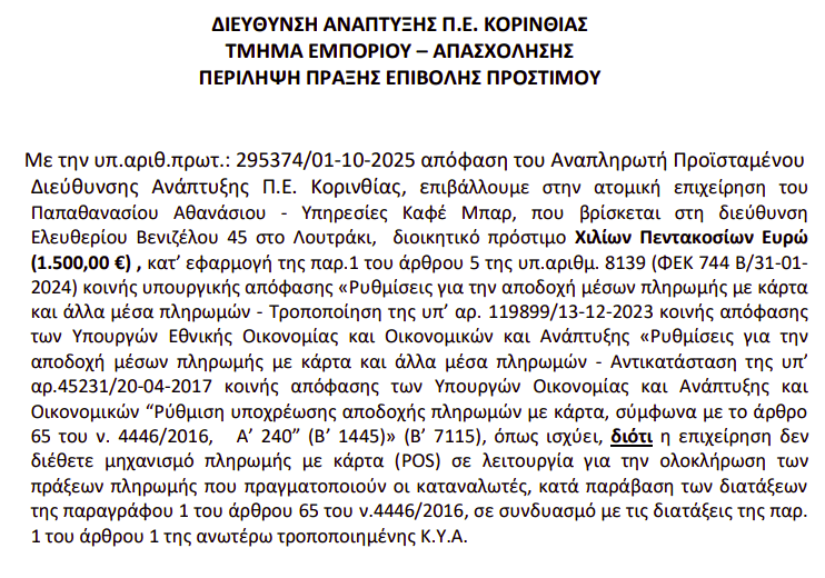 Αρχική/Συμβαίνει στο Λουτράκι/Το πρόστιμο των 1.500 ευρώ σε καφέ μπαρ στο Λουτράκι Το πρόστιμο των 1.500 ευρώ σε καφέ μπαρ στο Λουτράκι Τελευταία ενημέρωση: 10 Οκτωβρίου 20250 Δημοσίευσε Facebook X LinkedIn Tumblr Pinterest Messenger Messenger Viber Κοινή χρήση μέσω email Εκτύπωση Η απόφαση που αναρτήθηκε στην περιφέρεια Πελοποννήσου: Τελευταία ενημέρωση: 10 Οκτωβρίου 20250 Δημοσίευσε Facebook X LinkedIn Tumblr Pinterest Messenger Messenger Viber Κοινή χρήση μέσω email Εκτύπωση Δημοσίευσε Facebook X LinkedIn Tumblr Pinterest Messenger Messenger WhatsApp Telegram Viber Κοινή χρήση μέσω email Εκτύπωση