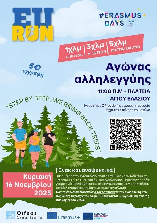 Ο αγώνας δρόμου “EUrun” ανακοινώνει τη νέα ημερομηνία διεξαγωγής του: Κυριακή 16 Νοεμβρίου 2025, στο Ξυλόκαστρο, με στόχο την προώθηση της αθλητικής συμμετοχής και την ενίσχυση της τοπικής κοινωνίας.