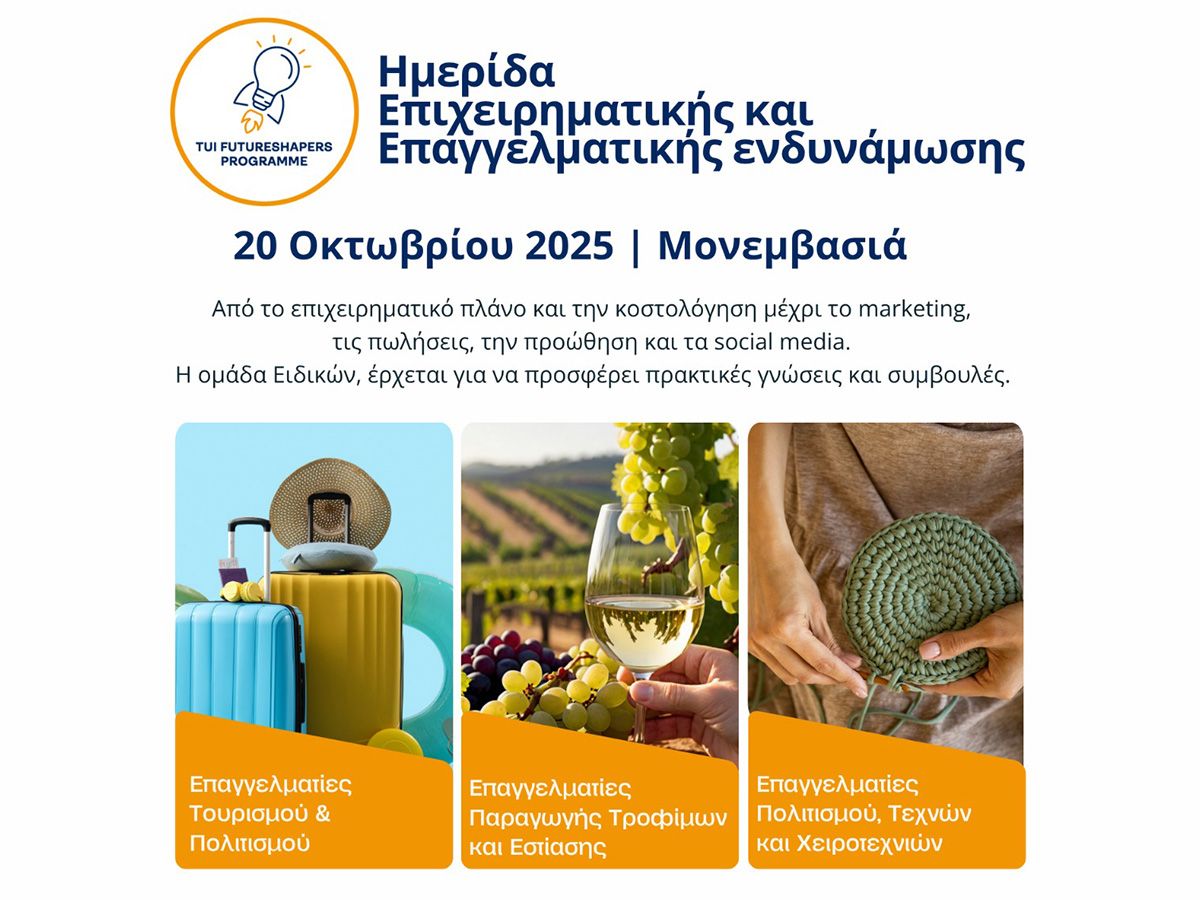 Η Wise Greece, με την υποστήριξη του TUI Care Foundation και σε συνεργασία με το Peloponnese Tourism Academy της Περιφέρειας Πελοποννήσου και τον Δήμο Μονεμβασίας, σας προσκαλεί στην Ημερίδα Επιχειρηματικής και Επαγγελματικής Ενδυνάμωσης – μια μοναδική ευκαιρία για επαγγελματίες ή επιχειρηματίες να ενισχύσουν τις γνώσεις και τις δεξιότητές τους.