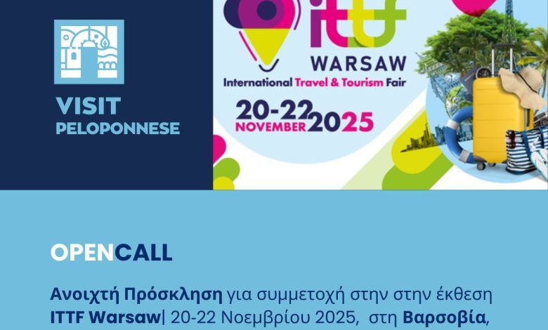 Η Περιφέρεια Πελοποννήσου θα συμμετάσχει ως Συνεκθέτης του ΕΟΤ στην έκθεση ITTF Warsaw 2025 (International Travel & Tourism Fair), με δικό της booth εντός του περιπτέρου του ΕΟΤ, και προσκαλεί όλους τους ενδιαφερόμενους φορείς, δήμους και τουριστικές επιχειρήσεις της Πελοποννήσου να δηλώσουν συμμετοχή.